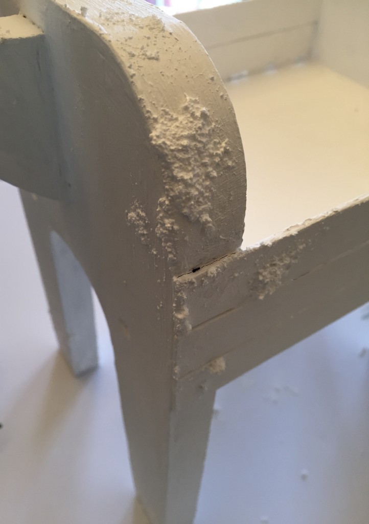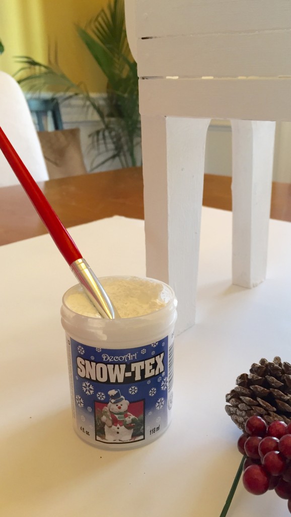 The first step was a good sand down followed by a coat of DecoArt paint in Everlasting, which gave the whole piece a fresh, chalky finish. Then came the part that really transformed him: Snow Tex from DecoArt. If you haven't used Snow Tex before, it's a white texturising product that creates a three-dimensional snow effect on whatever you brush it onto. You can layer it as thickly as you like to build up the texture, and the result looks remarkably realistic.