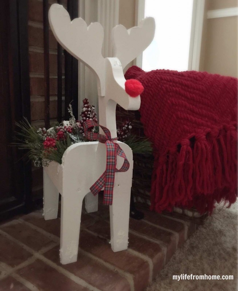 I applied it around the feet, across the antlers, along the tail, and into the little basket on his back. Then I filled the basket with a mix of real greenery and faux berry branches, painting them lightly with Snow Tex as well to give that just-dusted-with-snow look. A simple plaid bow around the neck finished him off, and honestly, he looks like something you'd find in a boutique homeware shop rather than a charity shop rescue.